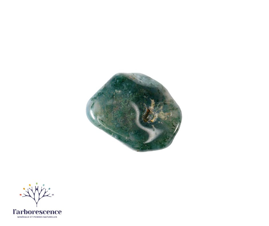 L’agate mousse est une pierre semi-précieuse appartenant à la famille des calcédoines. Elle se caractérise par sa transparence blanche ou légèrement laiteuse, dans laquelle se dessinent des inclusions vertes rappelant des branchages ou de la mousse, ce qui lui donne son nom évocateur. Chaque pierre est unique, avec des motifs naturels qui évoquent la nature et la vitalité.