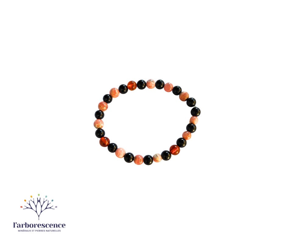 Le bracelet "Anti-stress" est réalisé en rhodochrosite, tourmaline et ambre.