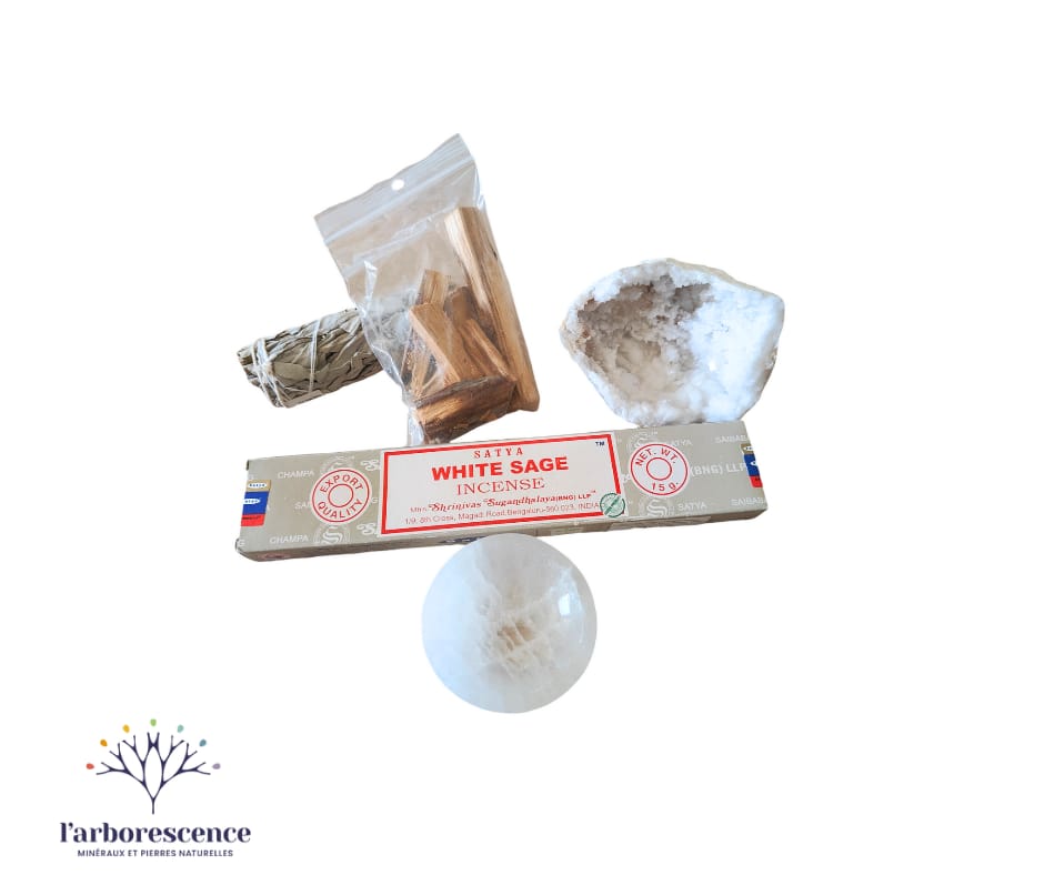 - Un sachet de palo santo, une boite d'encens et un fagot de sauge pour la purification des lieux et des minéraux.