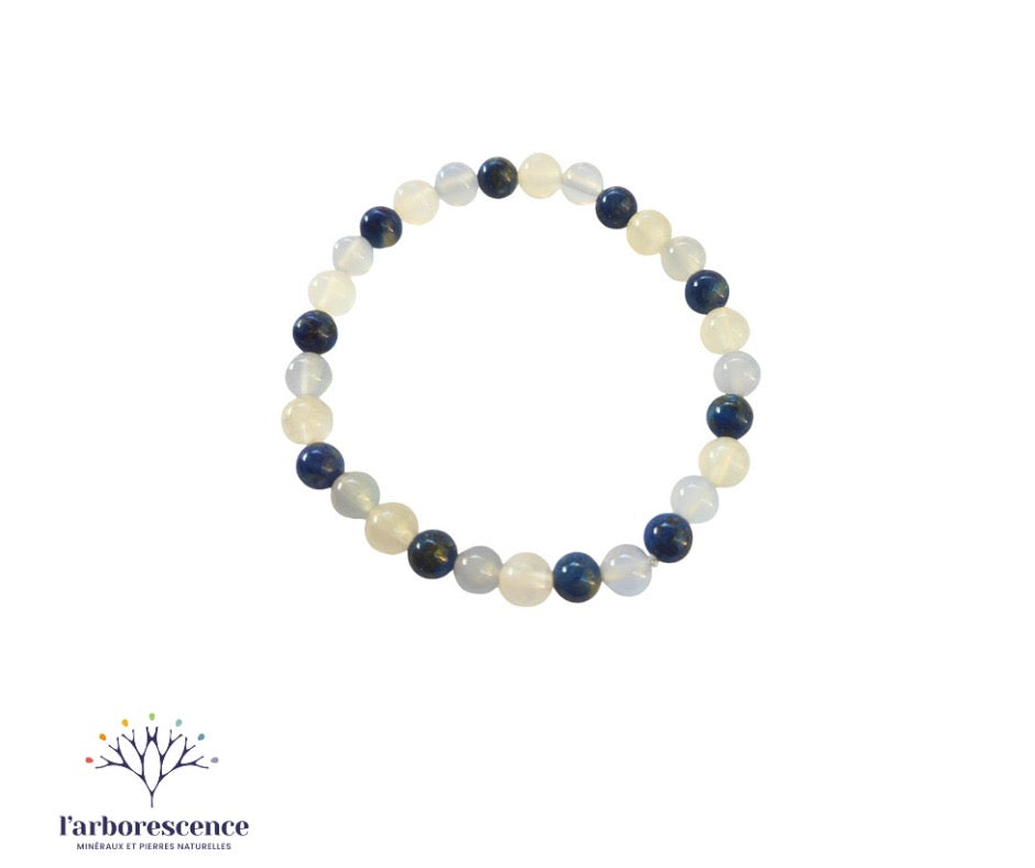 Le bracelet "Orateur" est réalisé en lapis lazuli, pierre de lune et calcédoine bleue.